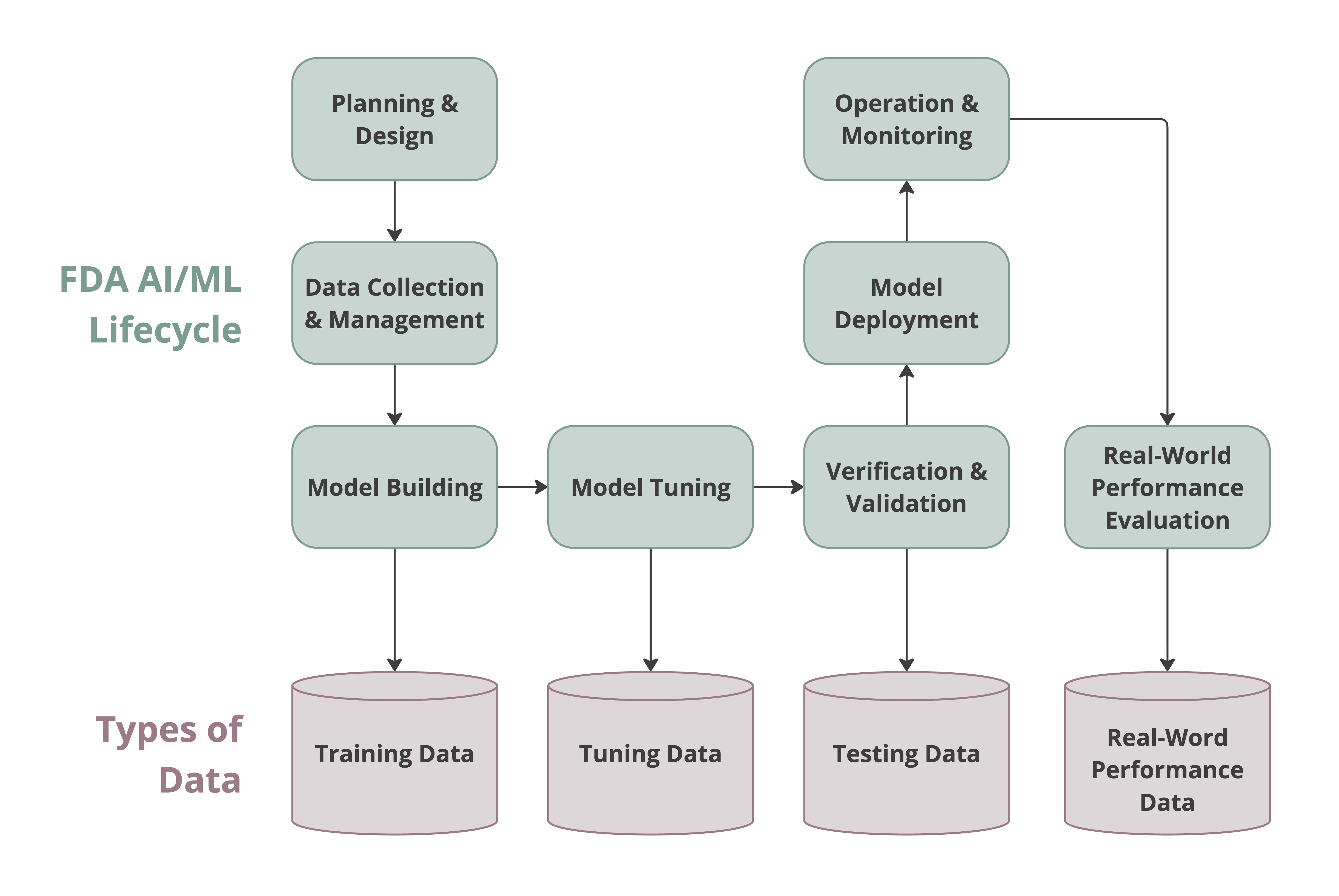 The figure below shows different types of data required against the AI/ML lifecycle phases defined by the FDA.