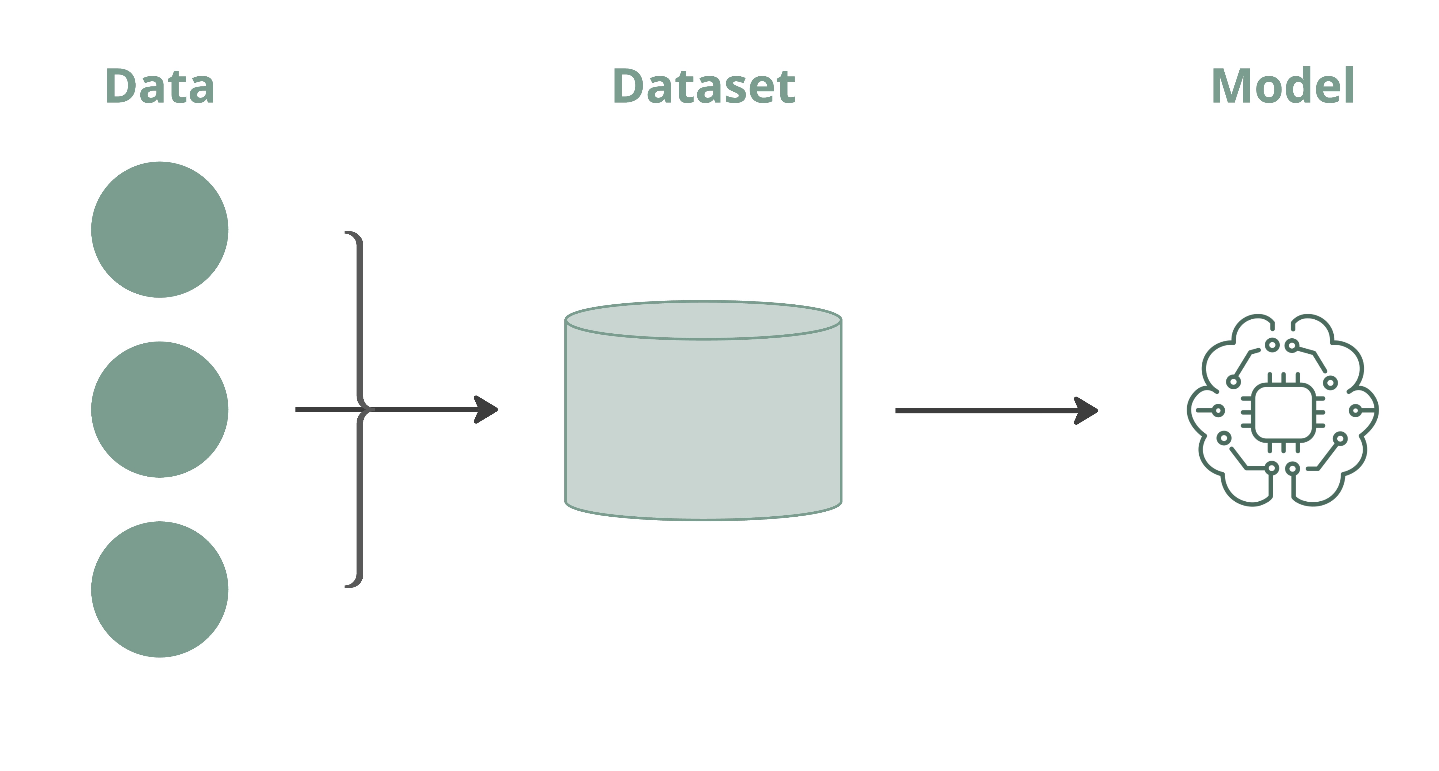 - Datasets are curated collections of data organized for a specific purpose. A dataset combines multiple data points with pre-processing (cleaning, annotation, and labelling), ultimately creating a structured package ready for model training.